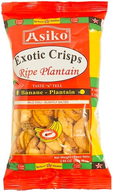Asiko Exotic Banana Plantain Crisps are crunchy snack chips made from carefully sliced ripe plantains. They are lightly fried to achieve a crisp texture while preserving the natural sweetness of plantain for a satisfying snack.